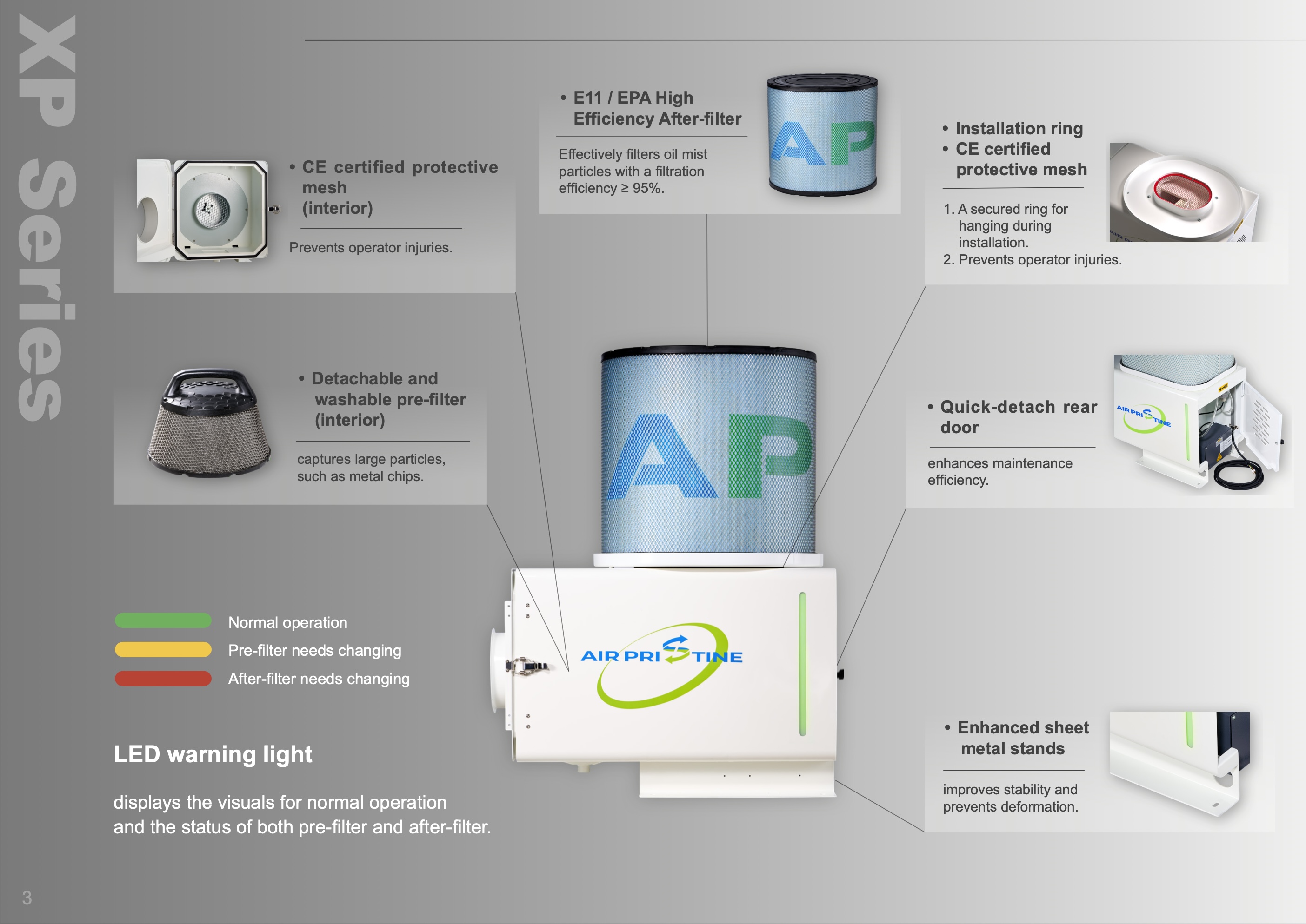 The core of the XP-20 is equipped with an EC motor. EC motors combine the high efficiency of DC motors with the stability of AC motors, using an electronic controller for commutation. This not only significantly reduces energy consumption but also ensures quieter operation, along with the advantages of long service life and low maintenance costs. The XP-20 is also the world’s first oil mist collector to adopt an EC motor. Its stator is precisely controlled by a programmable circuit board with a built-in microcontroller unit (MCU), providing multiple protection mechanisms including inrush current, rotor lock, overcurrent, undervoltage, overheating, and overload protection. Additionally, the fan blades of the EC motor are optimized using Computational Fluid Dynamics (CFD), achieving minimal power consumption while ensuring maximum airflow and pressure output.Product Specifications