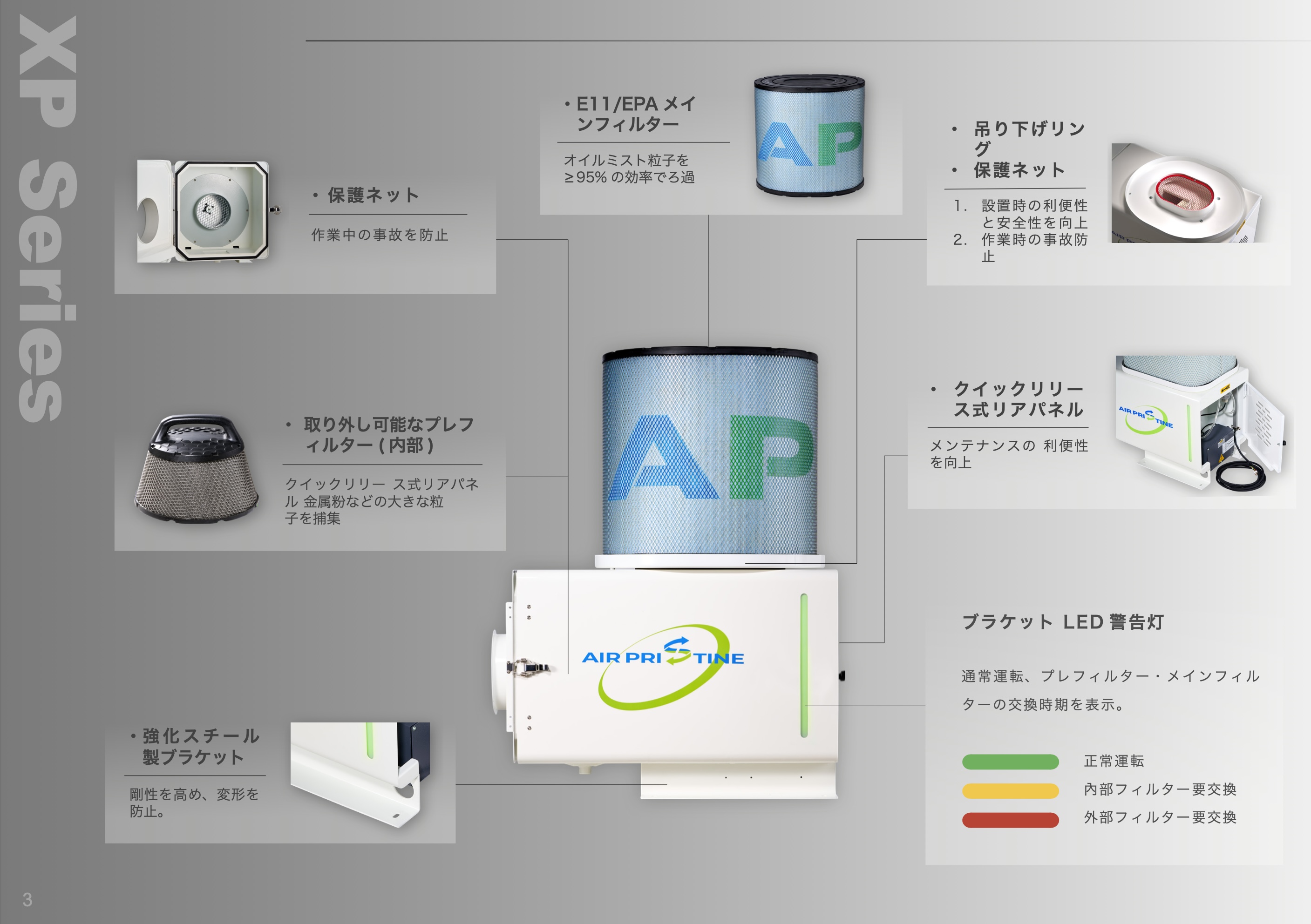 XPシリーズは高効率・省エネルギータイプであり、設計の重点は消費電力の削減とスマート制御能力の向上にあります。APシリーズと比較して、XP-20は最大65%の電力を節約でき、さらにPWM 0–10V制御信号に対応しており、現場のニーズに応じて風量を調整することが可能です。これにより、より精密なエネルギー管理と風量制御を実現し、省エネルギー効率を重視する工場環境に最適です。