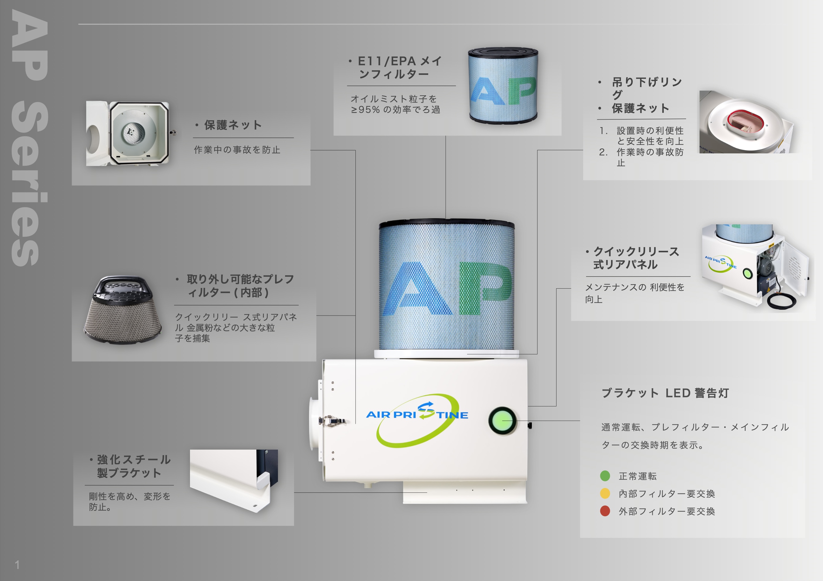 APシリーズオイルミストコレクターは、産業加工環境向けに特別に設計された特許取得済みの設計を採用しています。工作機械の切削加工時に切削液から発生するオイルミストを効果的にろ過し、微細な浮遊粒子までも捕捉することで、新鮮な空気を維持し、作業場の安全を確保します。本シリーズにはAP-10からAP-40までの4つのモデルがあり、風量設定のバリエーションにより、様々な工作機械のサイズや加工要件に柔軟に対応します。製品仕様