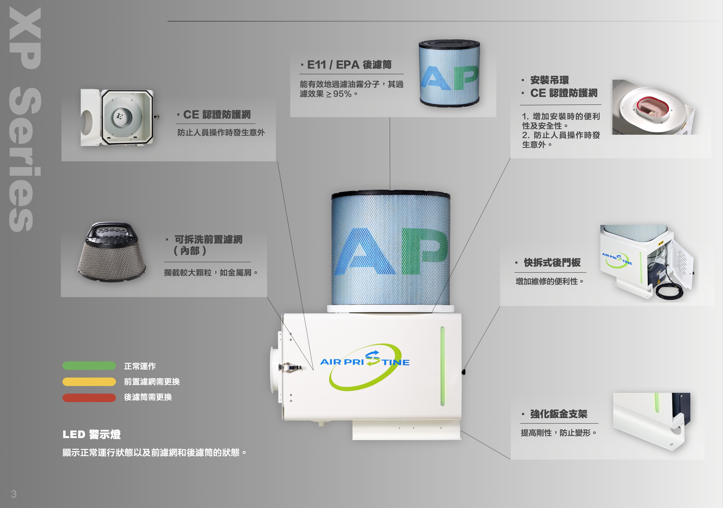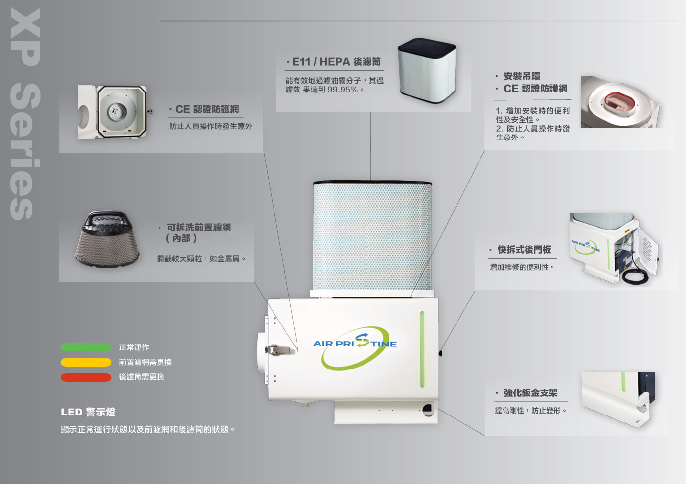 XP-20的核心採用EC馬達。EC馬達結合了直流馬達的高效率與交流馬達的穩定性,透過電子控制器進行換向,不僅大幅降低能耗,運轉更安靜,還具備長壽命與低維護成本的優勢。XP-20更是全球首款導入EC馬達的油霧回收機。其定子由內建微控制器單元 (MCU) 的可編程電路板精準控制,具備多重保護機制,包括電流浪湧、轉子鎖死、過電流、欠電壓、過溫與過載保護。同時,EC馬達的風扇葉片經由計算流體力學 (CFD) 優化設計,在確保最大氣流與壓力輸出的同時,達到最低功率消耗。產品規格