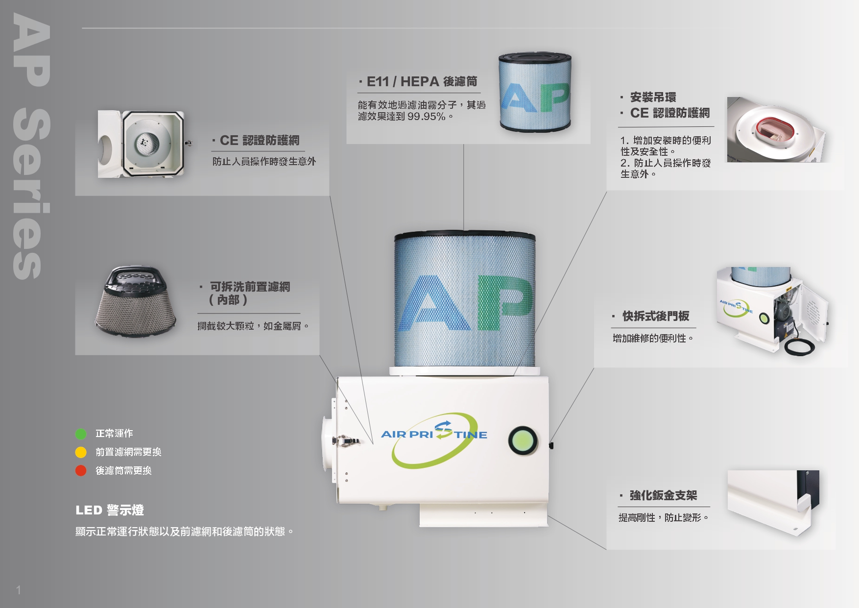 AP系列油霧回收機採用專利設計,專為工業加工環境打造,能有效過濾工具機在切削過程中因切削液所產生的油霧,連帶的微細懸浮粒子也能徹底捕捉,維持空氣清新與工作安全。全系列共有 AP-10 至 AP-40 四種機型,配置不同風量,能靈活滿足各式工具機尺寸及加工需求。產品規格